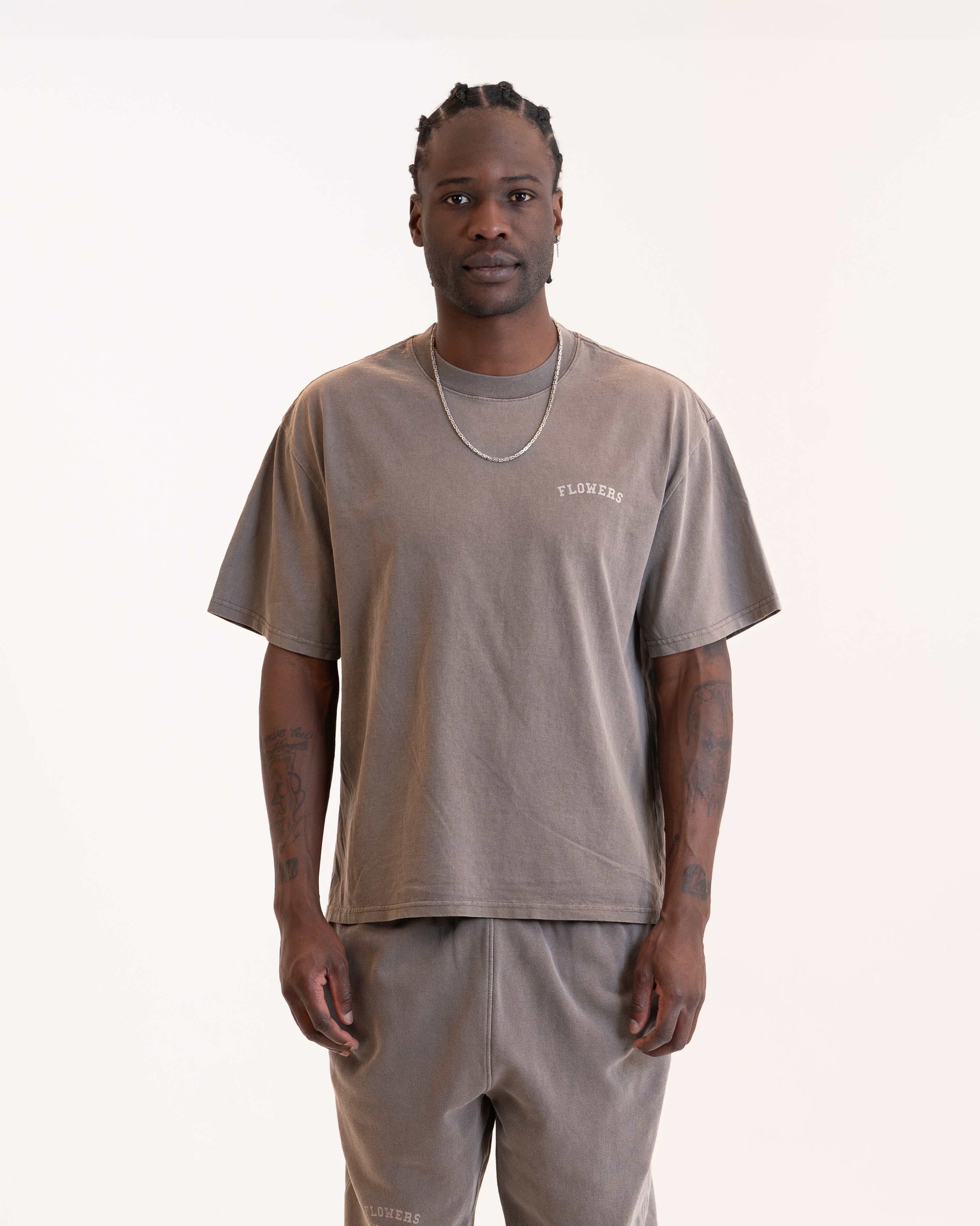 The design features a bold college-style Flowers for Society back logo that makes a statement, paired with a minimal chest logo on the front for a balanced, elevated aesthetic. Each piece is garment dyed, giving it a uniquely soft feel and rich, lived-in color that gets better with wear.